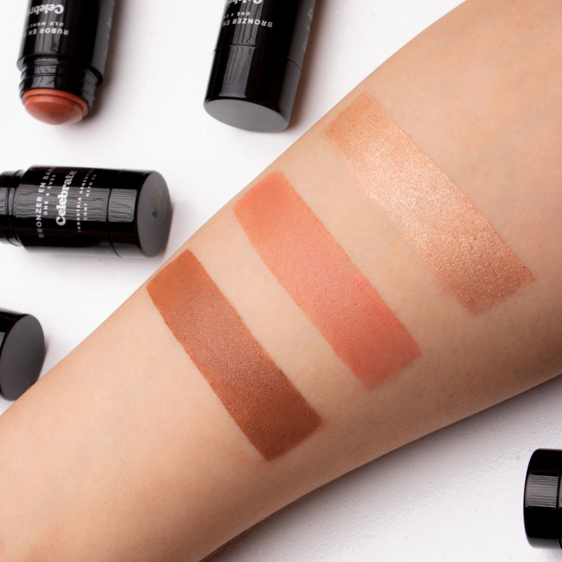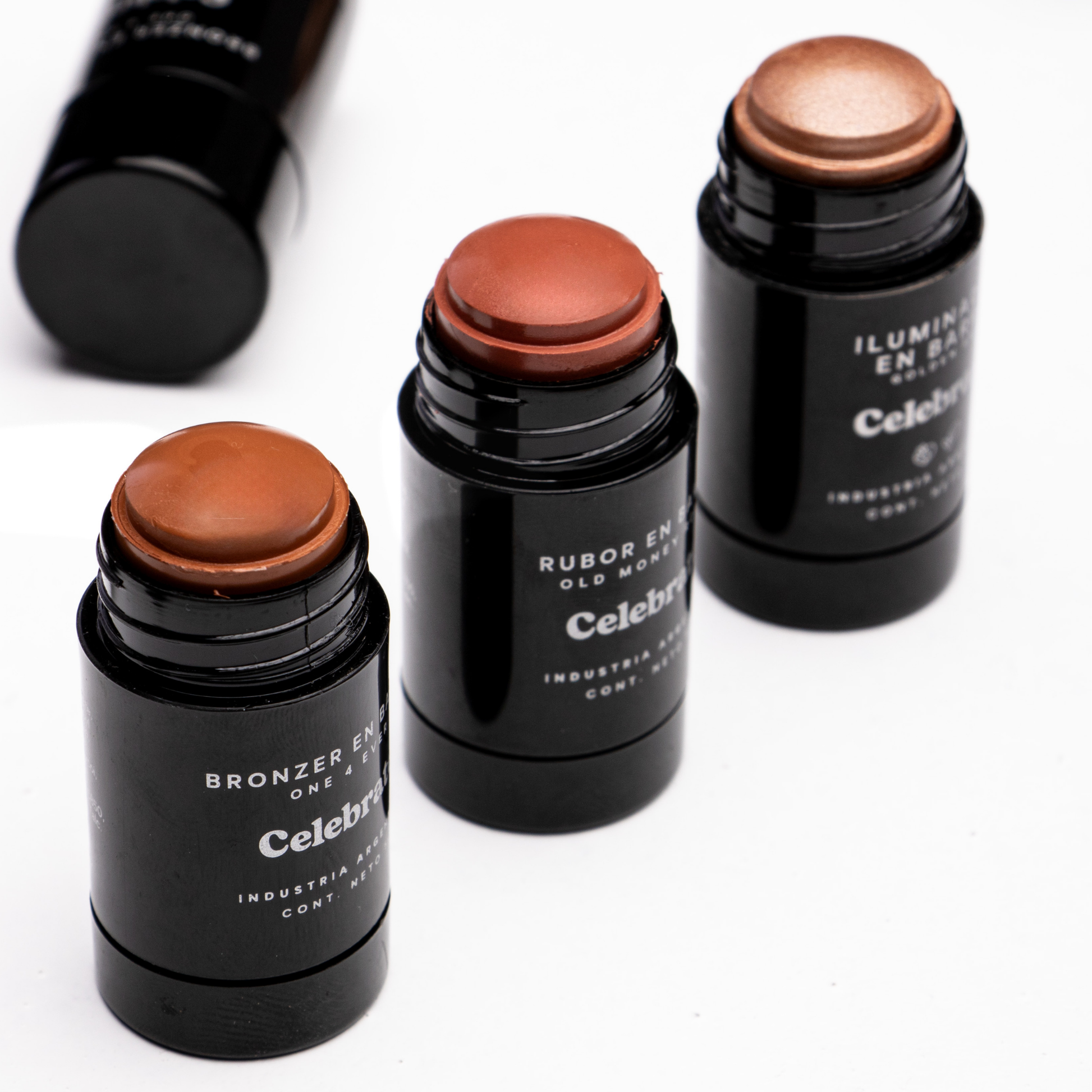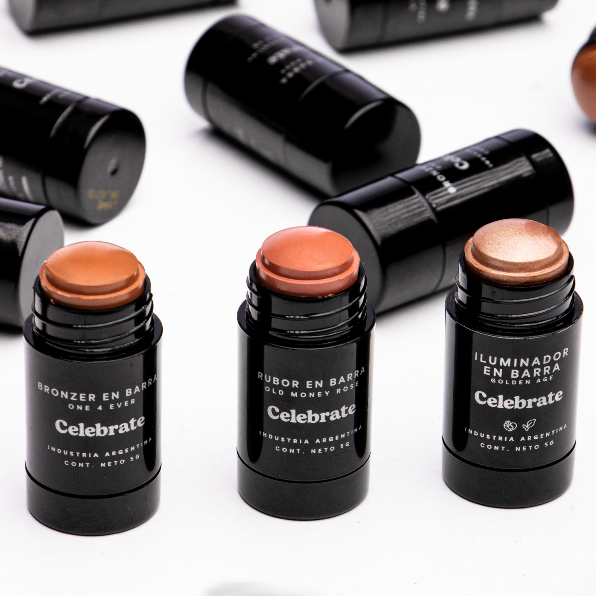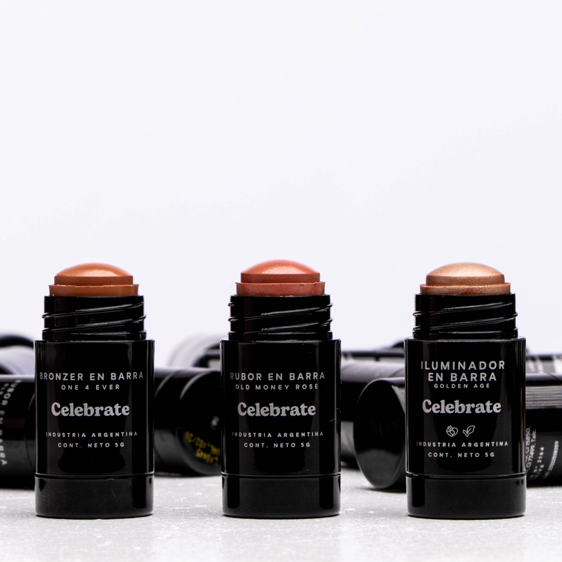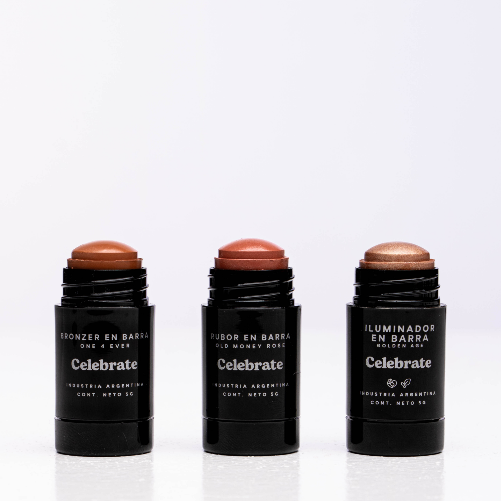 Lográ un maquillaje práctico, rápido y con acabado profesional con el Kit en Barra Celebrate. Este trío de productos en formato stick —bronzer, rubor e iluminador— es ideal para quienes buscan un look natural y radiante sin complicaciones. Su textura cremosa y fácil de difuminar permite una aplicación sin esfuerzo, perfecta para usar en casa o retocar fuera de ella.